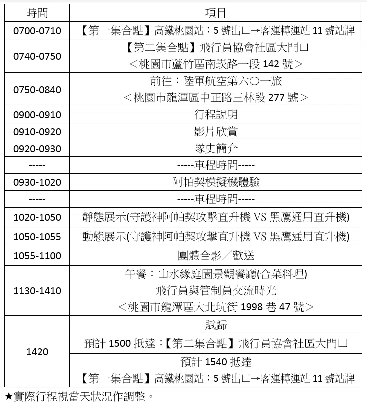 參訪期間兩會人員除了參訪部隊設施,也參訪模擬機訓練,包含AH64 長弓阿帕契、UH60 黑鷹及OH58 奇歐瓦戰搜直升機靜態展示,進行軍機飛行上的交流。